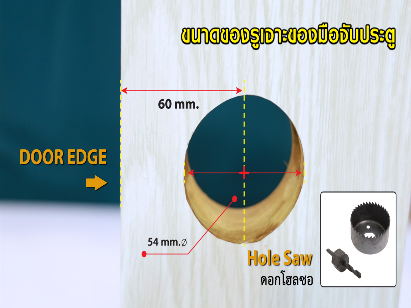 - วัดระยะเพื่อกำหนดจุดเจาะชุดมือจับ จากขอบประตู ถึงจุดศูนย์กลางเจาะ 60 มิลลิเมตร ใช้ดอกเจาะโฮลซอ ขนาด 54 มิลลิเมตรเจาะรูทั้ง 2 ฝั่ง