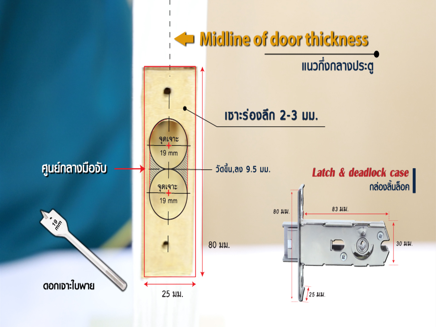 - กำหนดจุดเจาะที่สันประตู โดยการแบ่งแนวกี่งกลางประตู / จากนั้นวัดขึ้นจากจุดศูนย์กลาง 19 มิลลิเมตร และมาร์คจุดเจาะ / จากนั้นทำการวัดลงจากจุดศูนย์กลาง 19 มิลลิเมตร และมาร์คจุดเจาะ / ใช้ดอกเจาะใบพายขนาด 19 มิลลิเมตร เจาะ 2 รู ใช้สิ่วเซาะร่องให้เรียบ / นั้นนำลิ้นกุญแจมาใส่เพื่อทาบใช้ดินสอร่างขอบหน้าเพจและใช้สิ่วเซาะร่องลึกลงไปในเนื้อไม้ 1-2 มิลลิเมตร / เพื่อฝังเพจลิ้นกุญแจให้เสมอเรียบกับเนื้อไม้