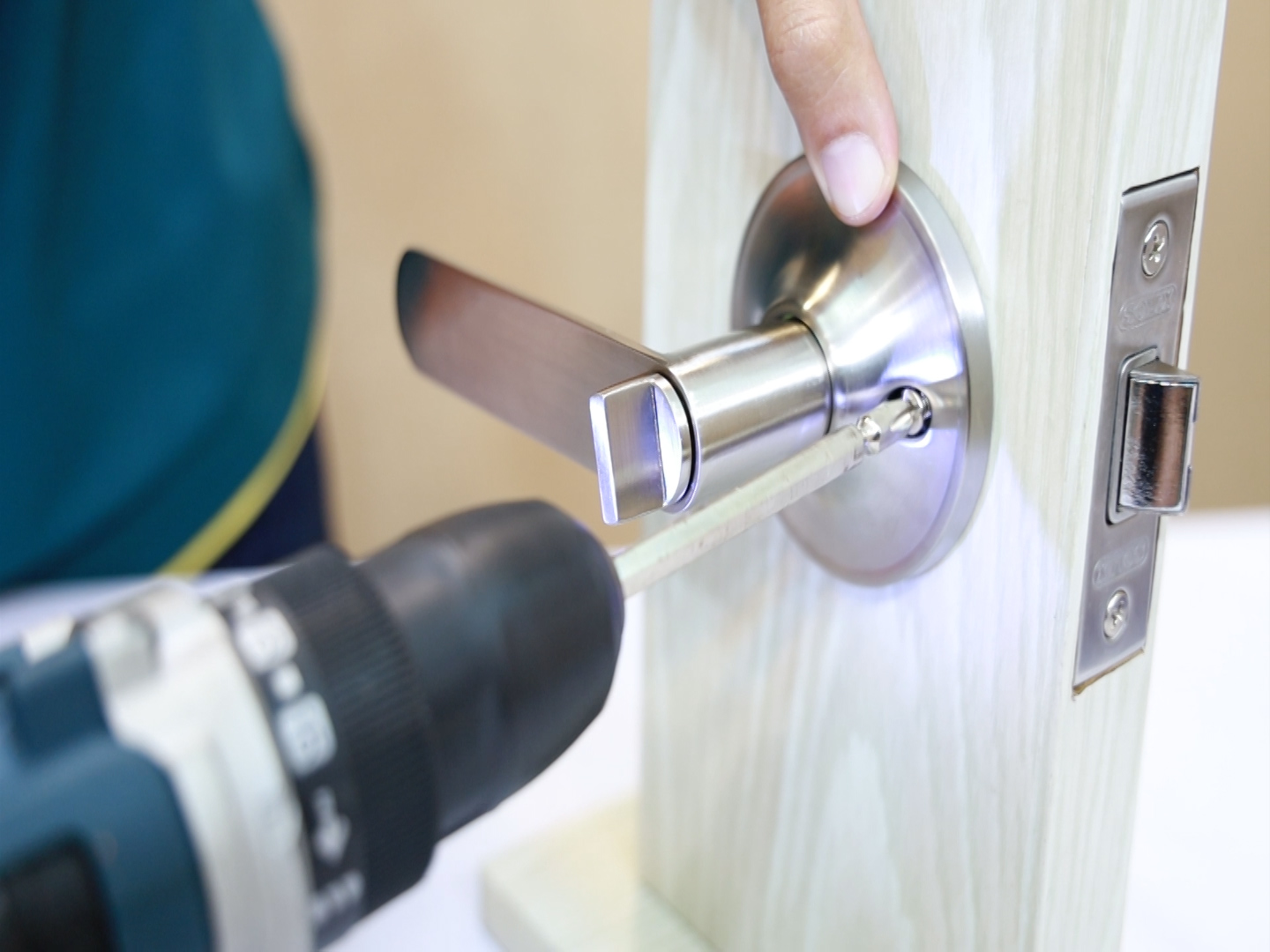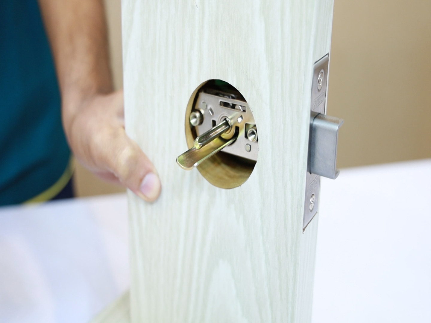 ในการติดตั้ง เจาะรูใช้วิธีเดียวกับการติดลูกบิดประตูทั่วไป จะพิเศษกว่าตรงที่การเจาะรูเดือยกุญแจที่จะมีขนาดที่ใหญ่กว่า เริ่มการติดตั้งสำหรับประตูใหม่