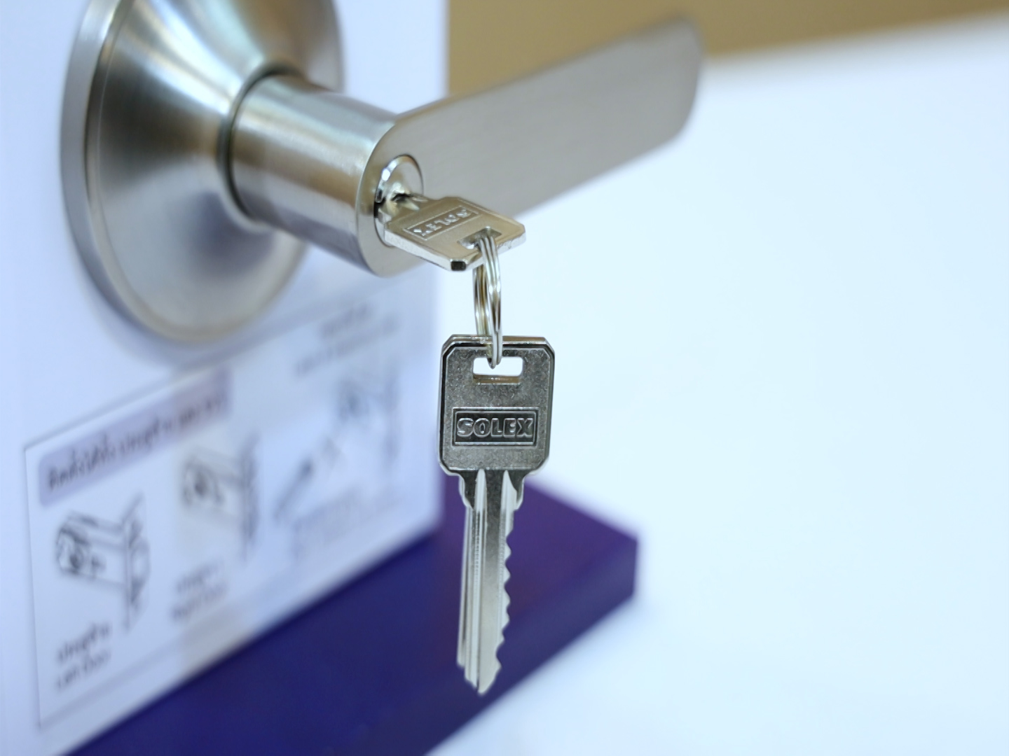 เริ่มติดตั้งง่ายๆ สามารถเปลี่ยนแทนลูกบิดเดิมได้ เพียงเจาะเพิ่มไม่กี่ขั้นตอน หากกติดลูกบิดเดิมอยู่ให้ถอดลูกบิดเดิมออก จะพบกับรูลูกบิดกลมๆ ขนาด 54 มม รูนี้ไม่ต้องขยายเพิ่ม แต่ให้มาสังเกตที่รูเดือยกุญแจ จะต้องมีการขยายเพิ่ม โดยการขยายจากรูเดิม ขึ้นและลง ด้านละ 4-5 มม. จากนั้นก็ใช้บุ้งไม้ตะใบเพื่อขยายรู โดยขยายสลับบนและล่างจนกว่าจะใส่ลิ้นเข้าไปได้ เมื่อใส่ลิ้นได้ วาดตามขอบของลิ้นกุญแจ ใช้สิ่วเซาะลึกประมาณ 2-3 มม. เพียงเท่านี้ก็จะสามารถติดตั้งได้