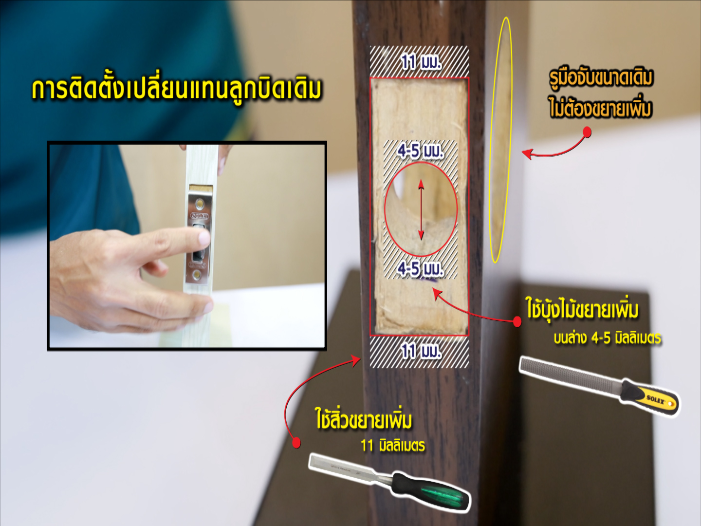 - ลิ้นกุญแจจะต้องมีการขยายเพิ่ม เนื่องจากลิ้นกุญแจ รุ่น 18 มีขนาดที่ใหญ่กว่าลิ้นลูกบิด จำเป็นต้องใช้ตะใบ และ สิ่ว เซาะตกแต่งขอบเพื่อขยายรูลิ้นเพิ่ม