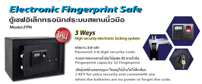 - การตั้งค่าบันทึกลายนิ้วมือ ทำได้โดยการปลดล็อคตู้ จากนั้น กดปุ่ม Reset สีแดง ภายในตู้บริเวณมุมช่องแบตเตอรรี่ 1 ครั้ง จะมีไฟสแกนนิ้วมือแสดงขึ้นมา ให้วางนิ้วมือลงทันที หน้าจอแสดงผล OK ถือว่าเป็นการบันทึกสมบูรณ์ สามารถบันทึกได้สูงสุด 32 ลายนิ้วมือ โดยการทำวิธีการเดิมซ้ำ ๆ ในการใช้งาน เมื่อปิดตู้เซฟต้องกด * เพื่อล็อคตู้ทุกครั้ง หากไม่ได้ล็อคตู้ ระบบจะส่งเสียงเตือน ปี๊บ..ปี๊บ.. ให้กดล็อคตู้เซฟ ในกรณีแบตเตอรรี่อ่อน ระบบจะหยุดทำการอัตโนมัติ ให้ใช้ดอกกุญแจไขเพื่อปลดล็อคตู้ และทำการเปลี่ยนแบตเตอรรี่ ระบบก็จะกลับมาทำงานได้ปกติโดยไม่ต้องตั้งค่าใหม่ กรณีต้องการลบ ลายนิ้วมือและรหัสผ่านทำได้โดยการกด ปุ่ม Reset ค้างไว้ 10 วินาที ระบบจะลบค่าทั้งหมดและกลับมาเป็นค่าโดรงงานเริ่มต้นให้ผู้ใช้งงานทำการตั้งค่าระบบใหม่