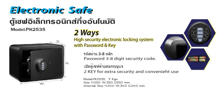 ตู้เซฟที่ใช้งานโดยทั่วไป จะมีอยู่ 2 รูปแบบ คือ แบบกึ่งอัตโนมัติ No.PK2535, แบบอัตโนมัติสแกนลายนิ้วมือ No.FPK2535,3038,5035